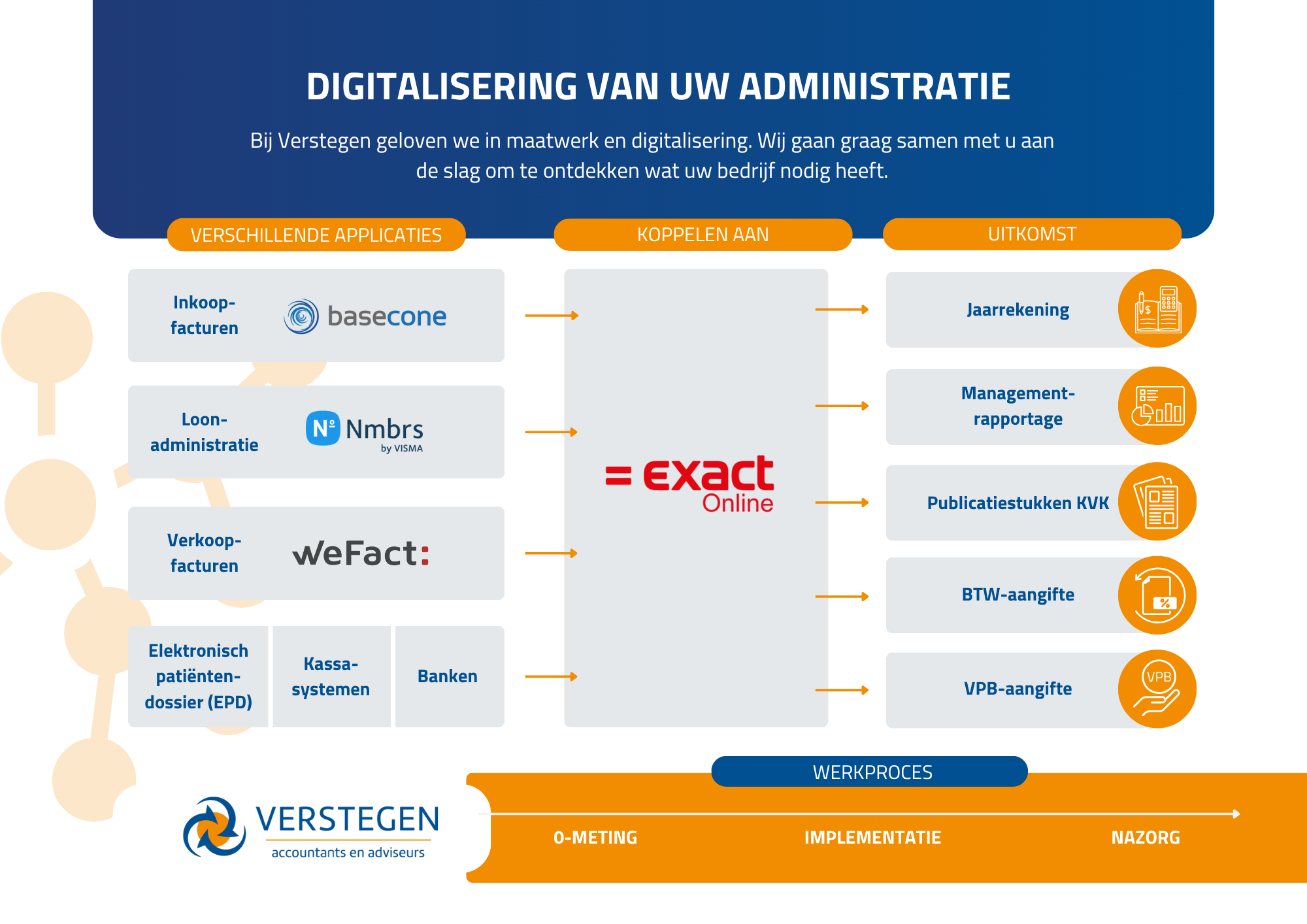 Digitalisering van uw administratieve processen, zoals de urenadministratie, de inkoopfacturatie en verkoopfacturatie maakt gegevens toegankelijker, vermindert de kans op fouten en bespaart tijd en kosten. “Met automatisering hoef je bijvoorbeeld een factuur voor de telefoonkosten niet meer handmatig over te typen. Dit kan volledig automatisch in de administratie verwerkt worden.” zegt Job-Adrie van der Laan, relatiebeheerder bij Verstegen accountants hierover.