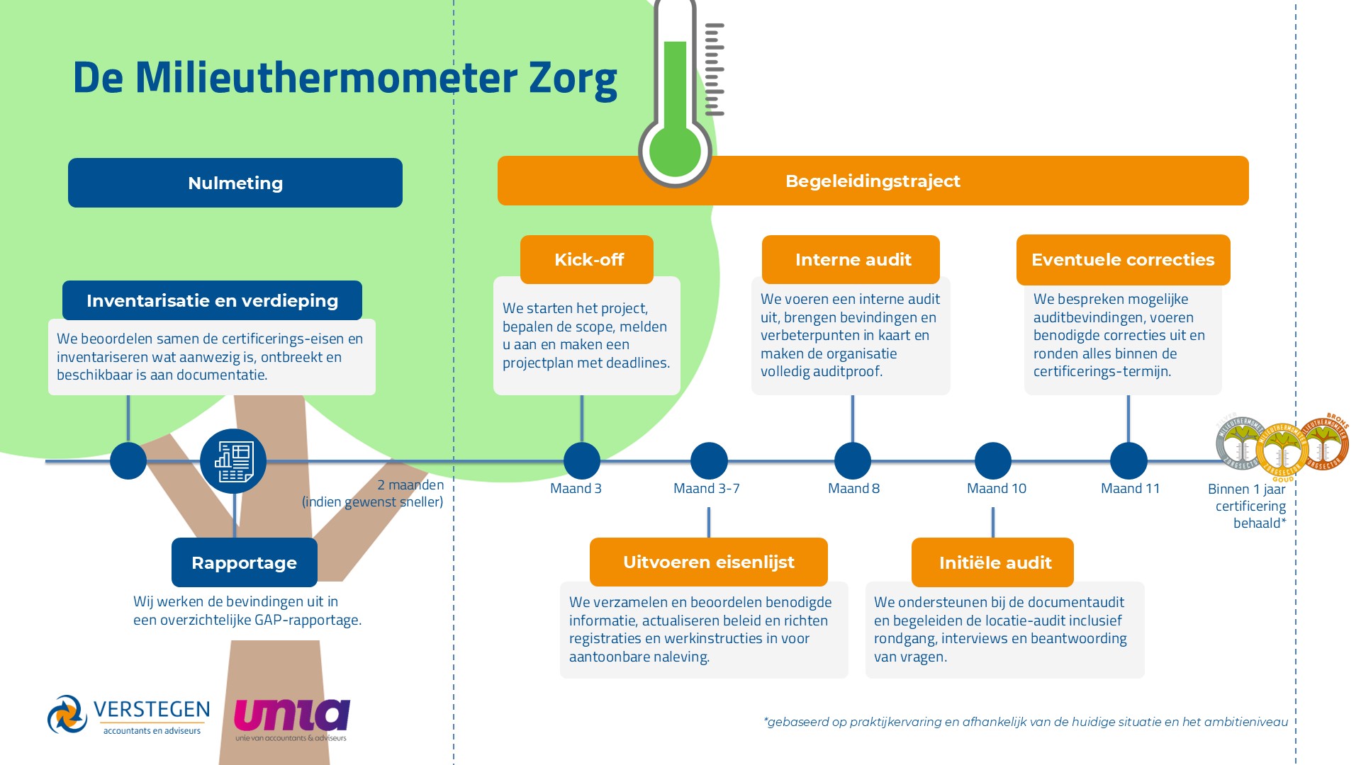 Het begeleiden bij het behalen van De Milieuthemometer Zorg doen we in samenwerking met Unia ESG-consulting. Door deze samenwerkingen kunnen we u naast dit begeleidingstraject u een volledige dienstverlening aanbieden op het gebied van ESG. Denk aan het ontwikkelen van een duurzame strategie, het opstellen van een ESG-rapportage waarin we onder andere uw duurzaamheidsinspanningen zichtbaar maken volgens CSRD of VSME-standaard. Ook kunnen we inzicht geven in uw CO2-uitstoot of u begeleiden bij de voorbereidingen, aanvraag en implementatie van andere relevante ESG-certificering. Wij bieden advies op maat dat past bij uw ambities.